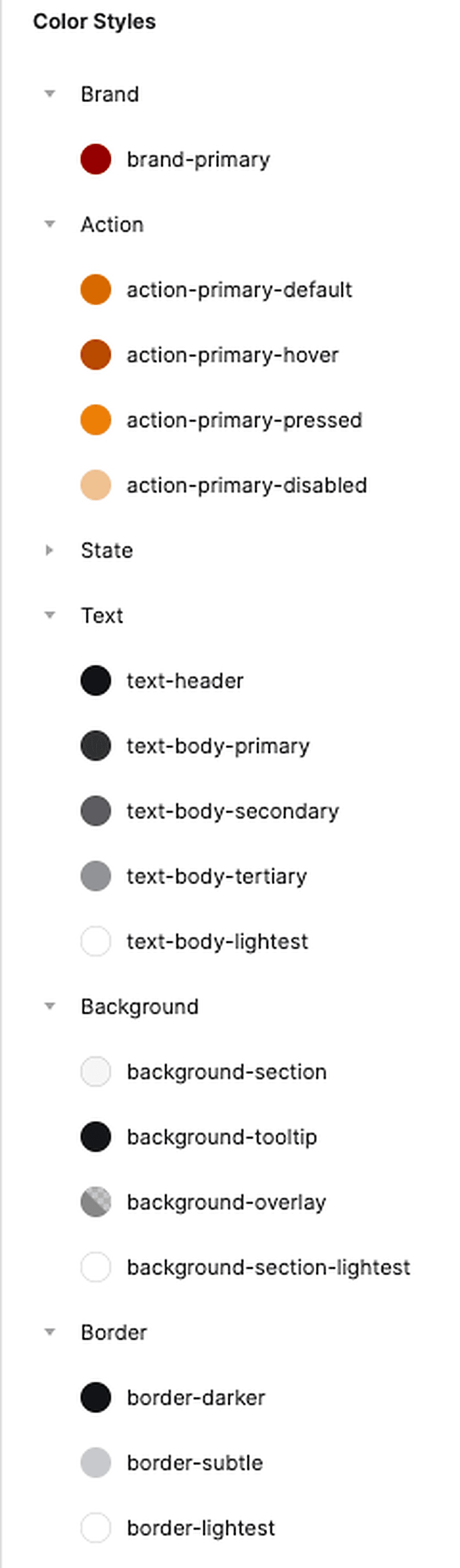 Brand, action, state, text, background, border, and social — every value tokenized so designers and engineers reference the same source of truth.