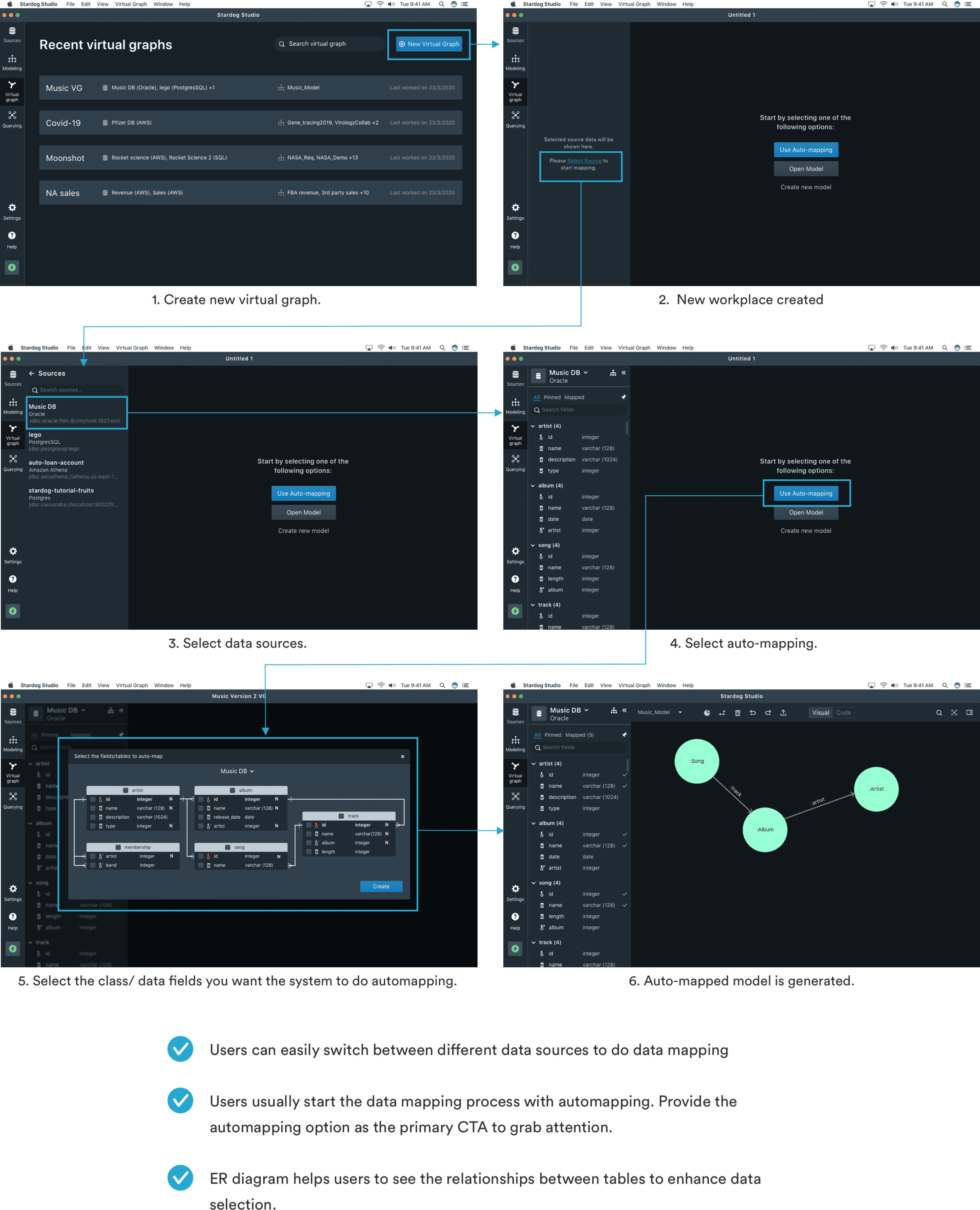 Majority of current users uses Auto-mapping functionlity as a starting point. So we highlighted ‘Auto mapping’ feature when users first create the virtual graph project.